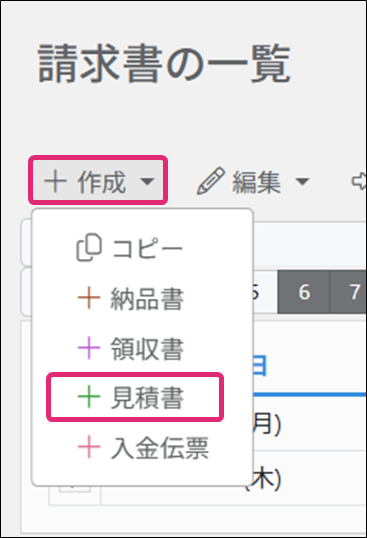 3. [請求書の表示]画面が表示されます。画面右上の[新規作成]→[+見積書]をクリックします。