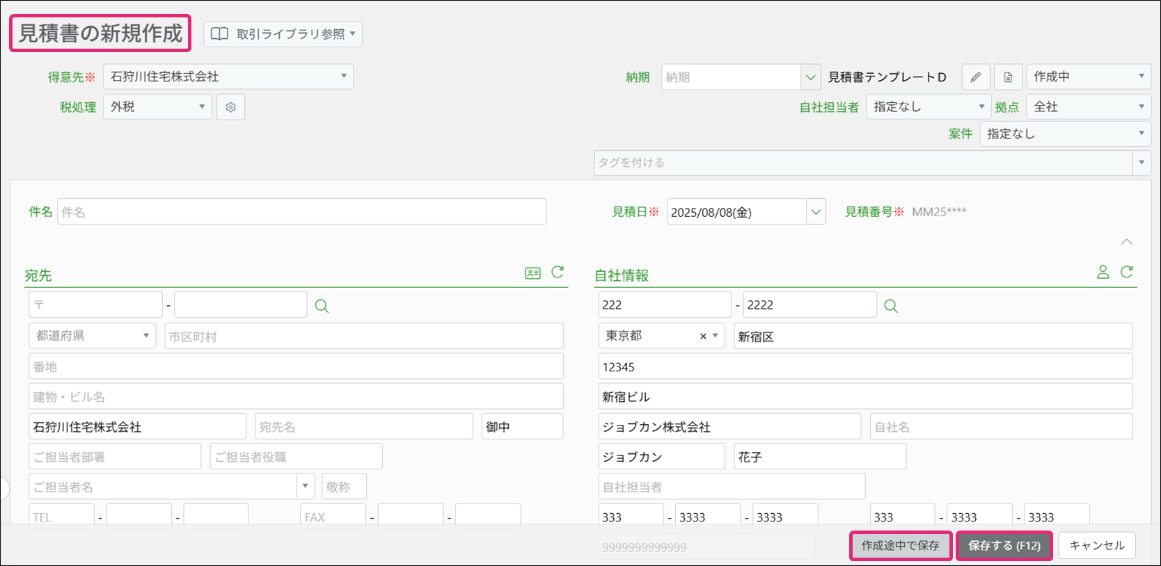[見積番号]は自動で入力され、「****」部分は保存時に数字に変換されます。一旦保存すると、編集画面で番号の変更ができます。