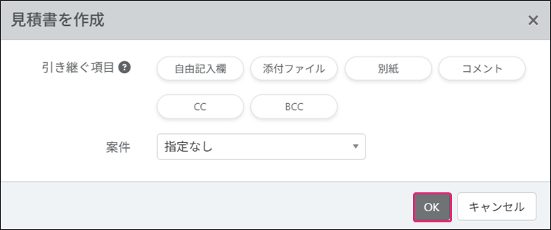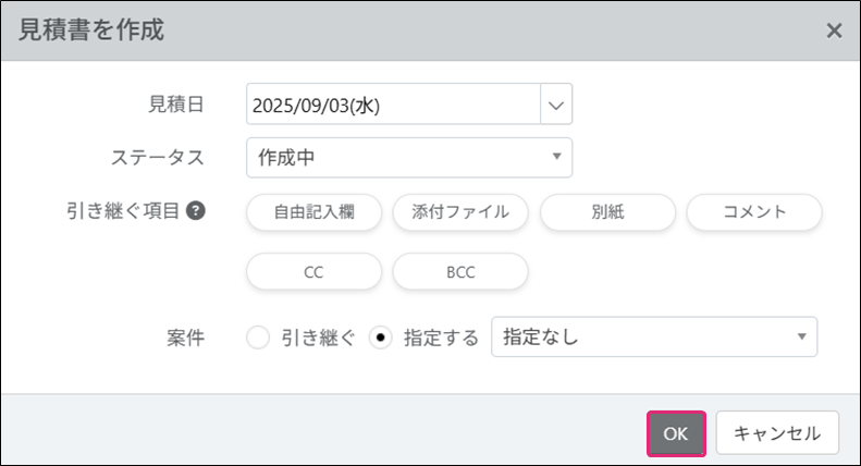 4. [見積書を作成]ダイアログが表示されます。各項目を設定し、[OK]をクリックします。
