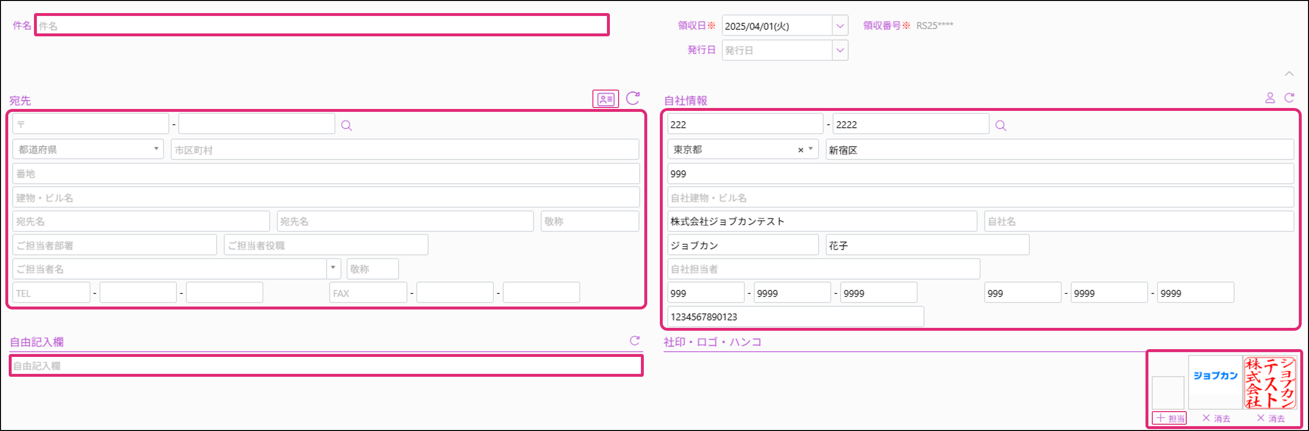 6. [件名][自由記入欄]などを入力したり、[宛先][自社情報]の修正をします。担当印は、手順4で自社担当者を選択後、[社印・ロゴ・ハンコ]にある[+担当]をクリックすると押印されます。