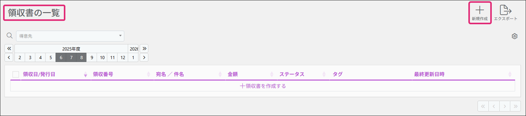 2. [領収書の一覧]画面が表示されます。画面右上の[新規作成]をクリックします。