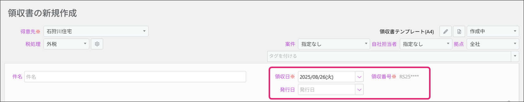 5. [領収日]と必要に応じて[発行日][領収番号]を入力します。※付番設定が「自動」の場合(デフォルト)