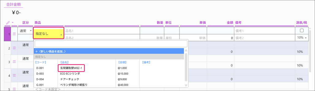 7. 明細入力部で[商品]の入力欄をクリックし、リストから商品を選択します。各商品に登録してある情報が入力されます。
