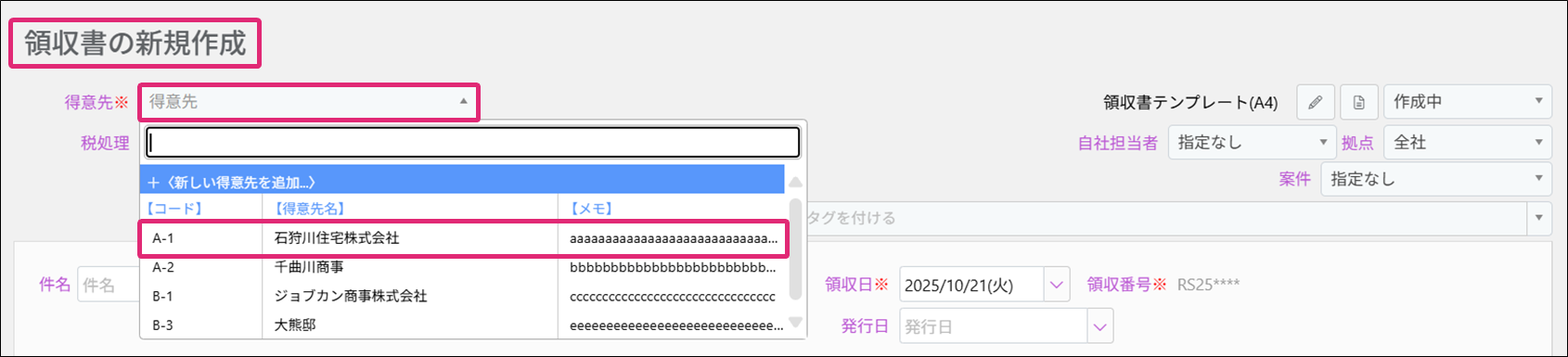 3. [領収書の新規作成]画面が表示されます。 [得意先]の入力欄をクリックし、リストから得意先を選択します。各項目に選択した得意先の情報が入力されます。