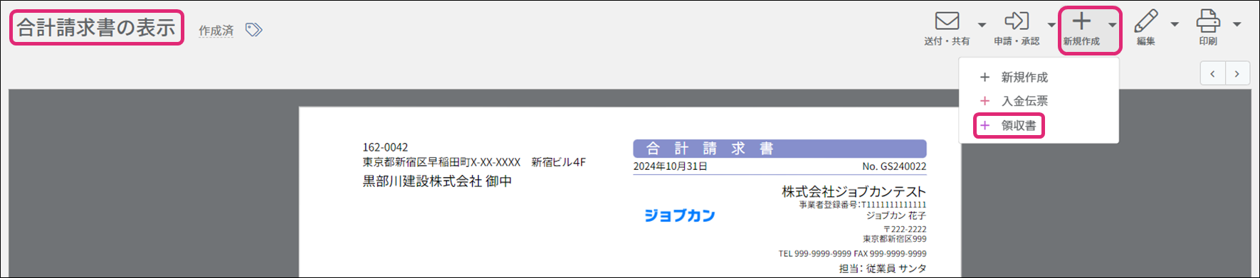 合計請求書の情報を引き継いだ領収書を作成します。