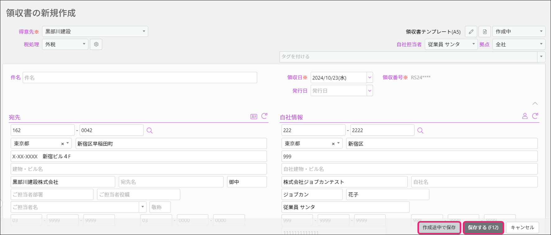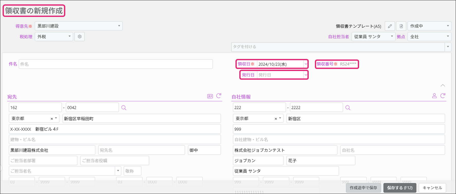 [領収番号]は自動で入力され、「****」部分は保存時に数字に変換されます。一旦保存すると、編集画面で番号の変更ができます。