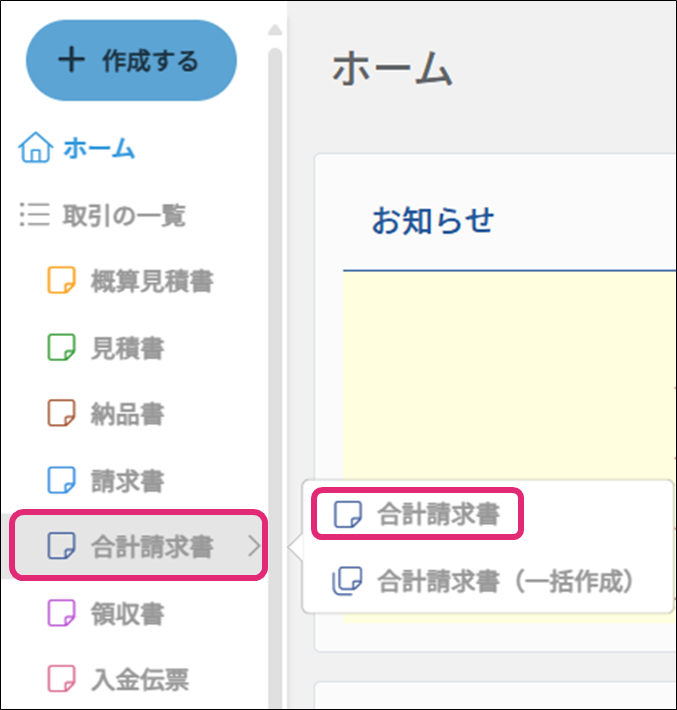 1. メニュー[合計請求書]→[合計請求書]をクリックします。