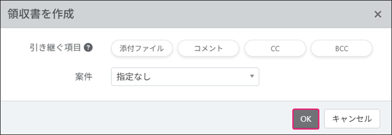 4. [領収書を作成]ダイアログが表示されます。各項目を設定し、[OK]をクリックします。