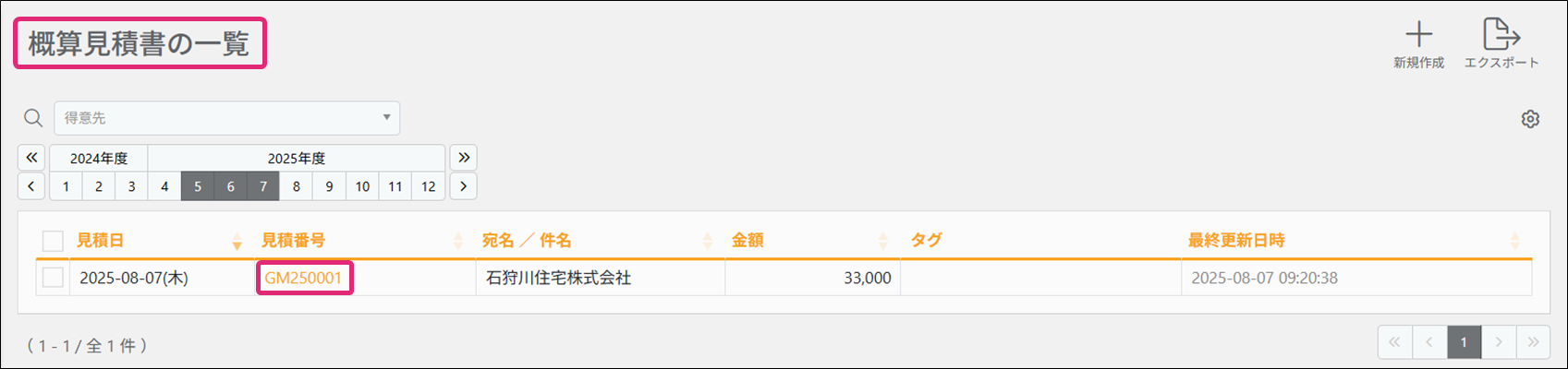2. [概算見積書の一覧]画面が表示されます。流用元になる概算見積書の「見積番号」をクリックします。