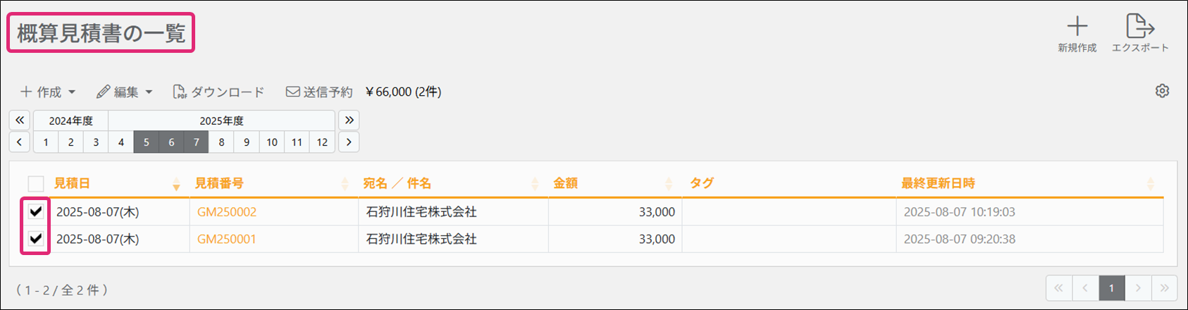 2. [概算見積書の一覧]画面が表示されます。流用元になる概算見積書のチェックボックスにチェックを付けます。