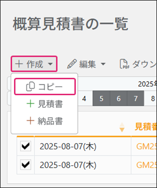 ※付番設定が「手動」の場合、枚数に関わらず、[概算見積書の一覧]画面からコピーをすることはできません。