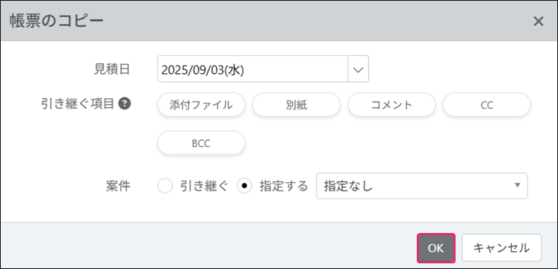 [引き継ぐ]を選択した場合、複写元の案件を引き継ぎ帳票が作成されます。