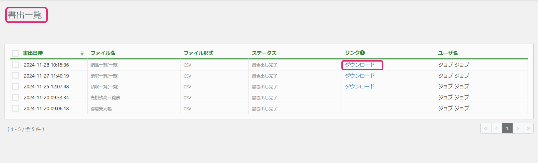 11. [書出一覧]画面が表示されます。該当データの行の[ダウンロード]をクリックします。