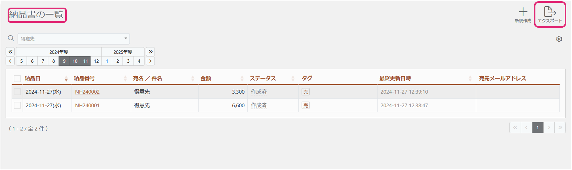 2. [納品書の一覧]画面が表示されます。画面右上の[エクスポート]をクリックします。