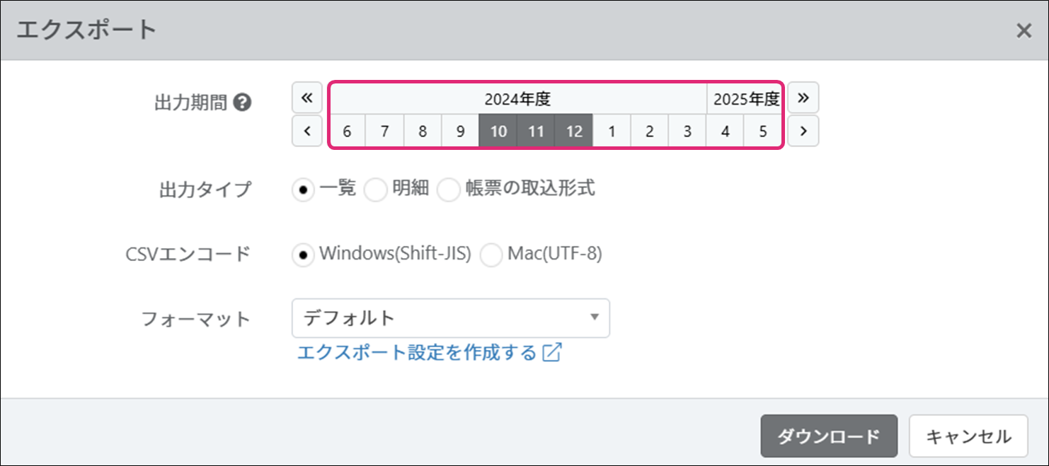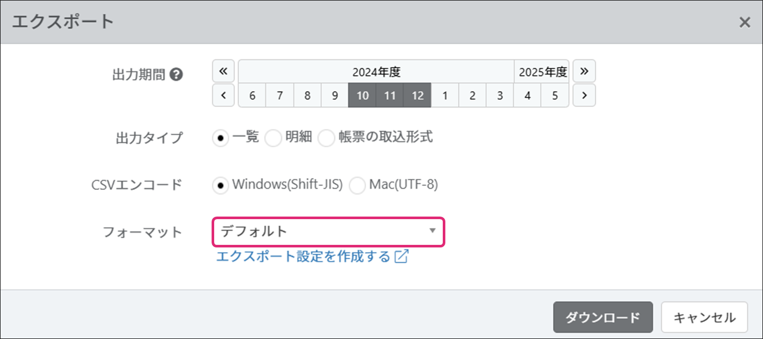 6. エクスポート項目のフォーマットを選択します。初期値は[デフォルト]です。