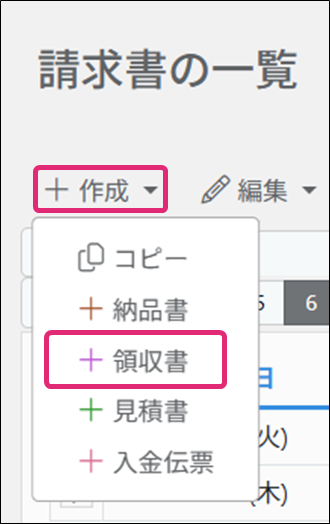 3. [+作成]→[+領収書]をクリックします。