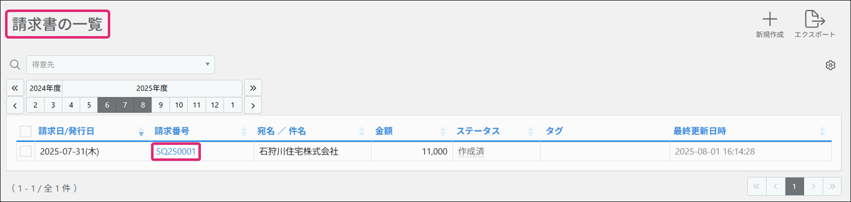 2. [請求書の一覧]画面が表示されます。領収書の元になる請求書の「請求番号」をクリックします。