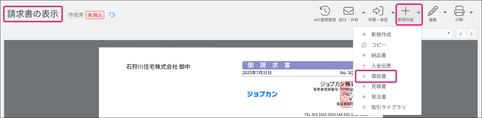 請求書の情報を引き継いだ領収書を作成します。