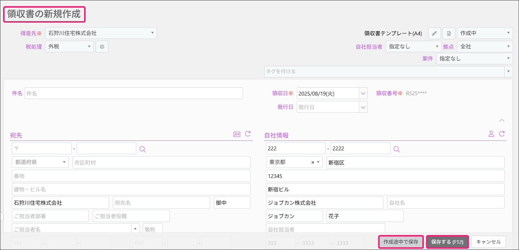 5. [領収書の新規作成]画面が表示されます。必要に応じて修正を加え、画面右下の[保存する]または[作成途中で保存]をクリックします。