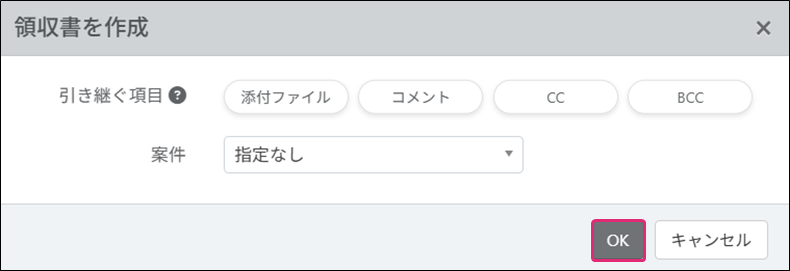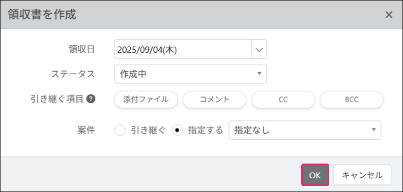 4. [領収書を作成]ダイアログが表示されます。各項目を設定し、[OK]をクリックします。