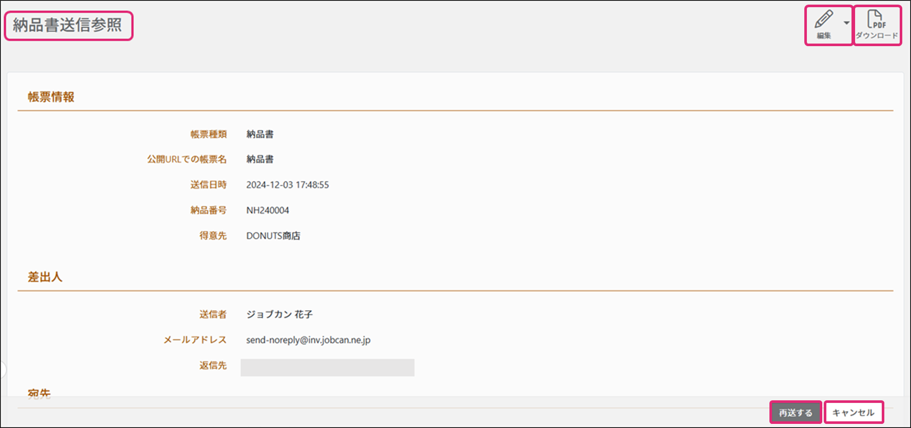 納品書、送信、確認、再送、非公開、ダウンロード