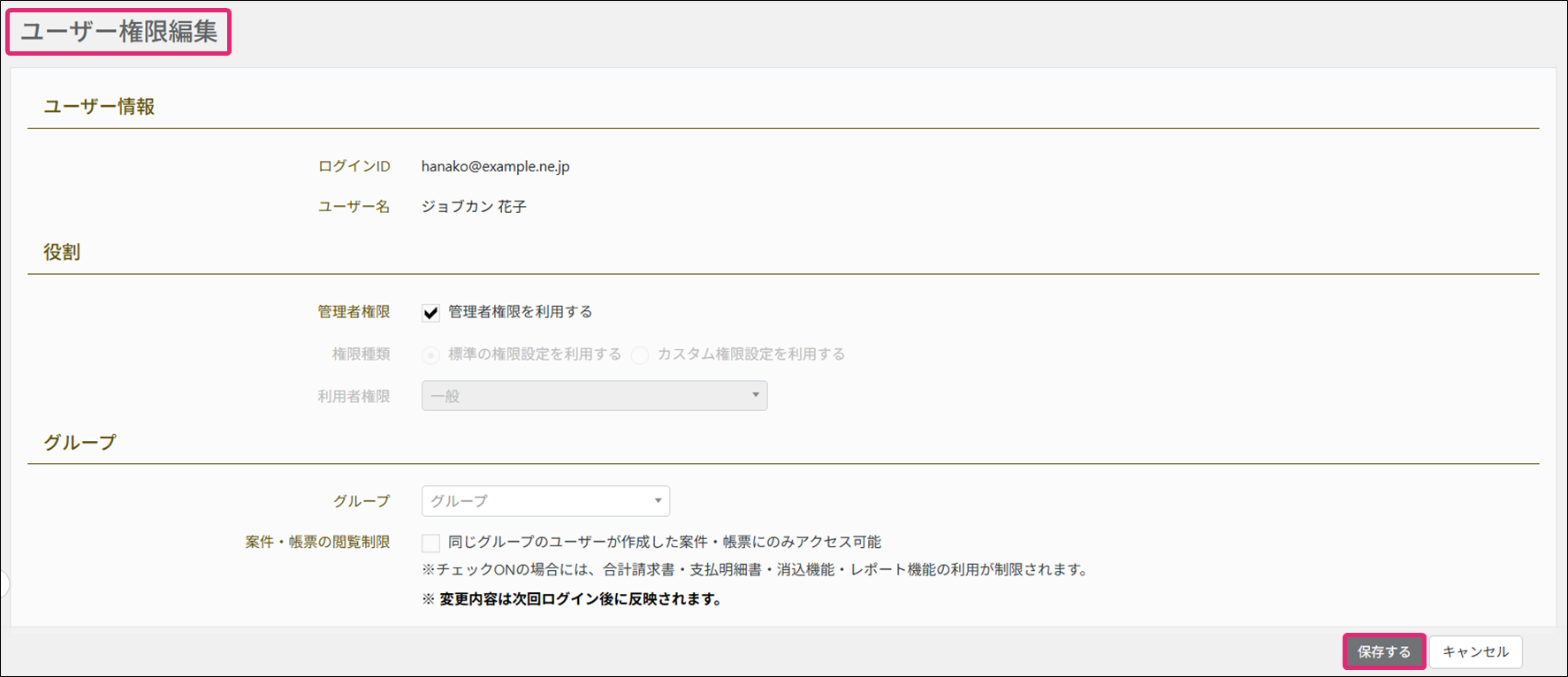3. [ユーザー権限編集]画面が表示されます。設定を変更し、[保存する]をクリックします。