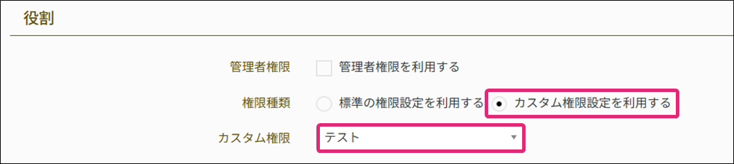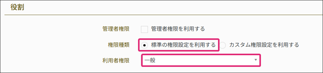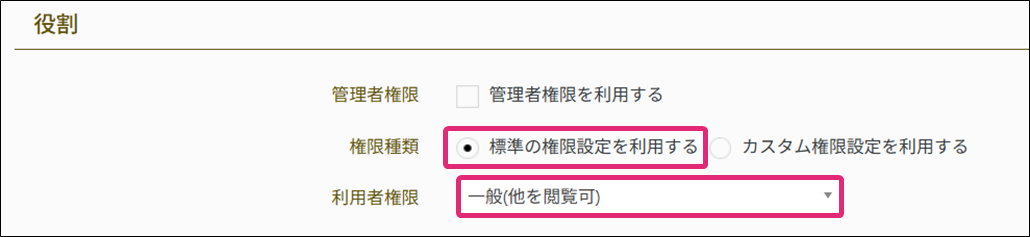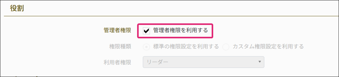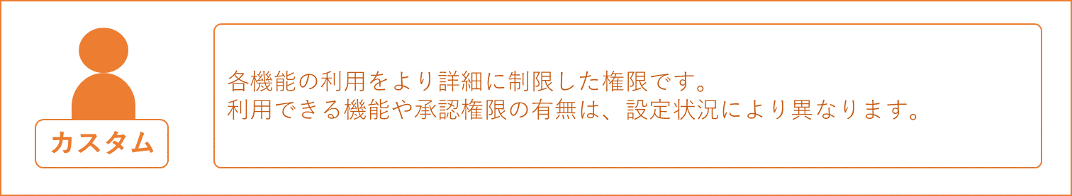管理者権限を付与する場合 リーダー権限を付与する場合 一般(他を閲覧可)権限を付与する場合 一般権限を付与する場合 カスタム権限を付与する場合 カスタム権限を追加する |