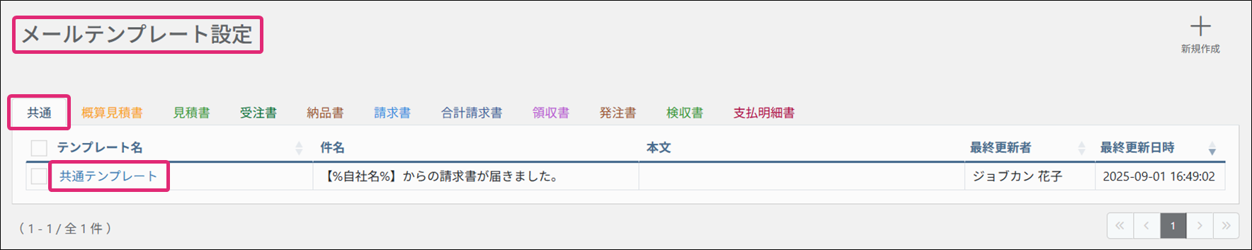 2. [メールテンプレート設定]画面が表示されます。削除したいテンプレートの帳票タブをクリックし、テンプレート名をクリックします。※プロフェッショナルプラン・トライアルプランの場合は、発注書/検収書/支払明細書のタブも表示されます。
