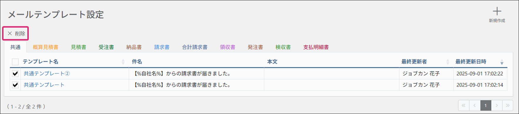 ※メールテンプレートは同一アカウント内のユーザー全員で共有します。削除した場合は、他のユーザー(同一アカウント内の場合)にも反映されますのでご注意ください。