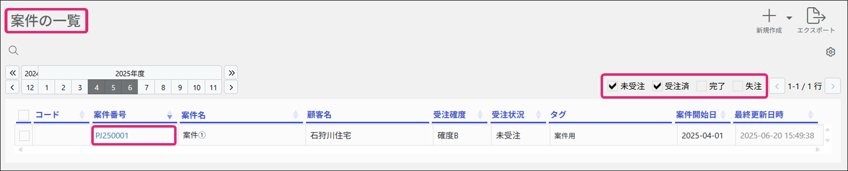 2. [案件の一覧]画面が表示されます。期間を指定し、経費を編集/削除したい案件に合わせて[未受注][受注済][完了][失注]にチェックを入れます。表示された案件の[案件番号]をクリックします。