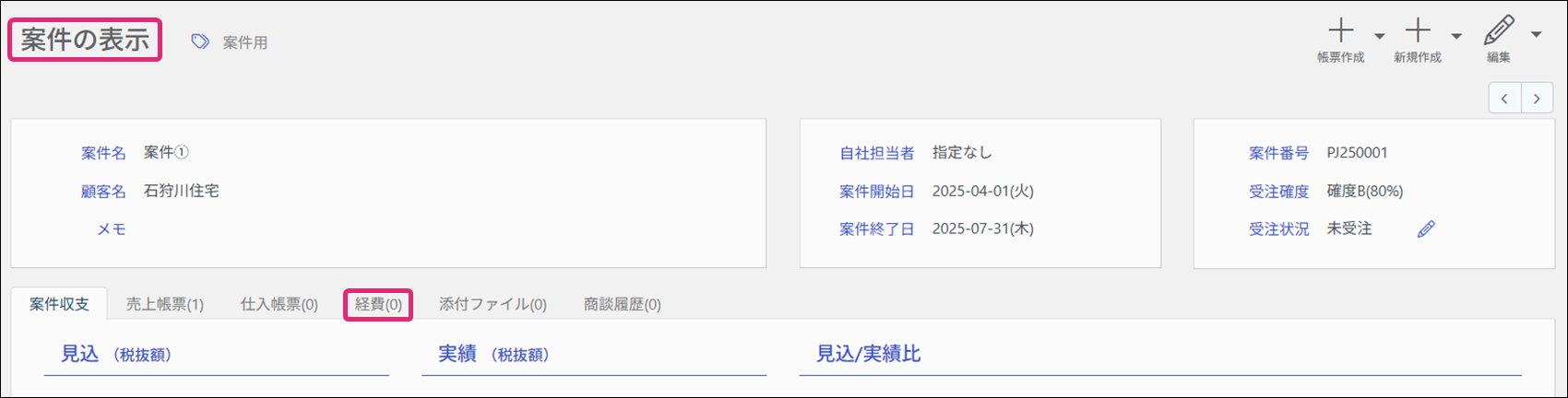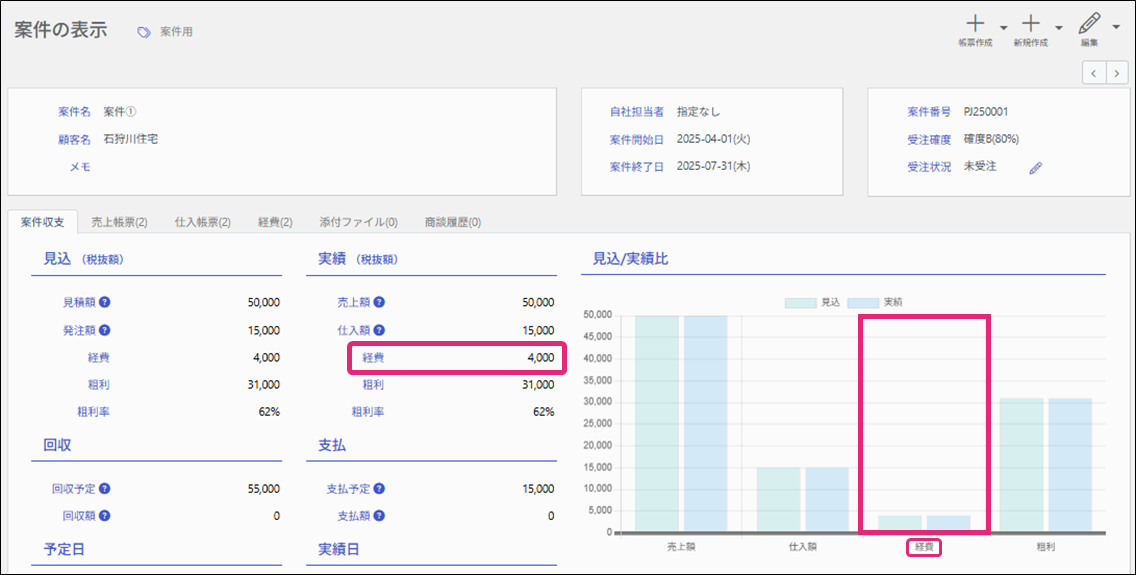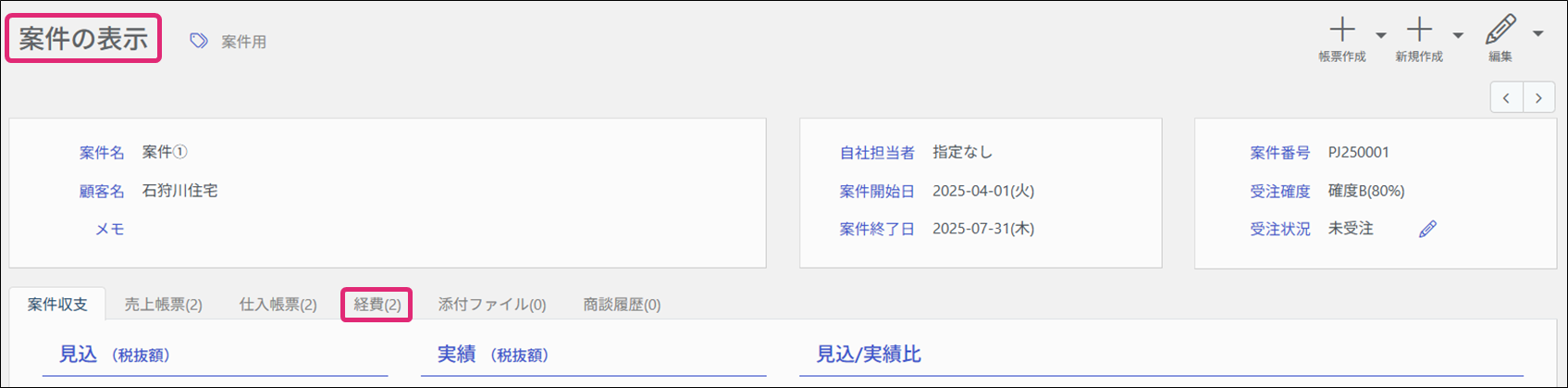 入力した経費の実績額は、[案件の表示]画面の[案件収支]のタブで確認できます。