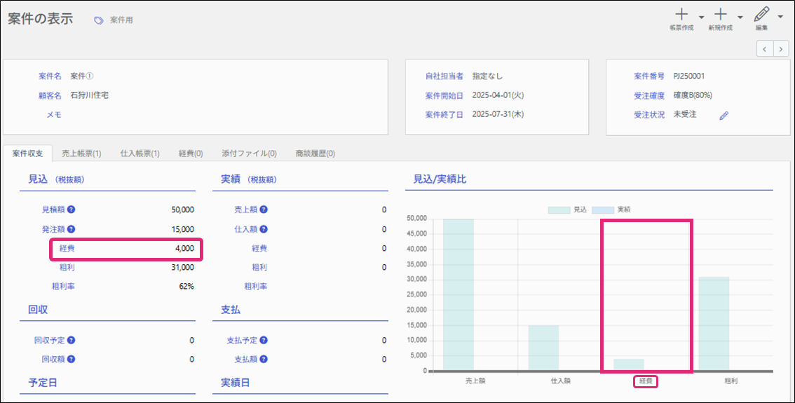 入力した経費の予定額は、[案件の表示]画面の[案件収支]のタブで確認できます。