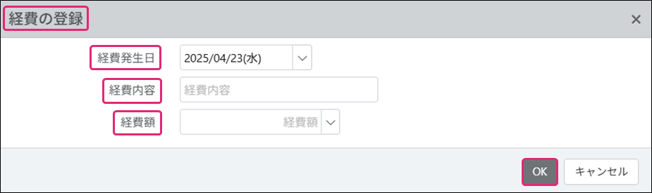 5. [経費の登録]が表示されます。[経費発生日]・[経費内容]・[経費額]を設定し、[OK]をクリックします。