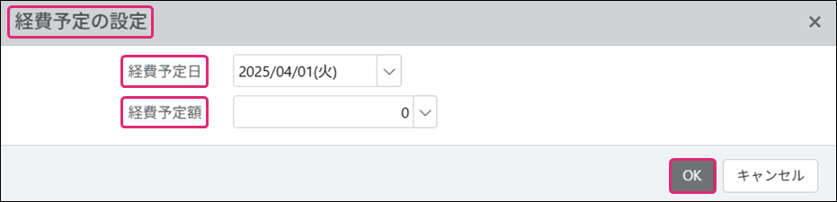 5. [経費予定の設定]が表示されます。[経費予定日]・[経費予定額]を編集し、[OK]をクリックします。