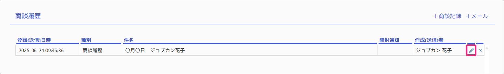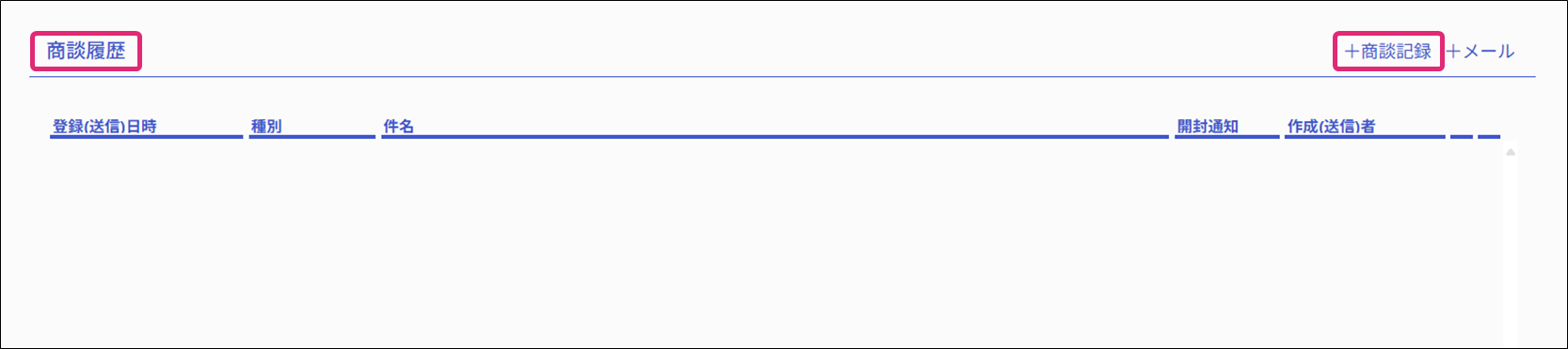 ※リーダー権限または一般(他を閲覧可)権限ユーザーの場合は、他のユーザー(同一アカウント内の場合)が作成した案件に商談履歴を追加することができます。他のユーザーが作成した案件の商談履歴の修正・削除ができるのは、リーダー権限のあるユーザーのみです。