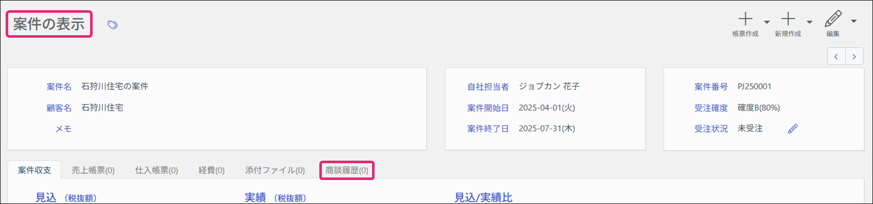 3. [案件の表示]画面が表示されます。[商談履歴]のタブをクリックします。