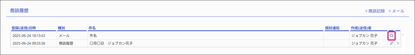 ※[商談履歴の一覧]では、商談履歴・メール・案件に紐づく帳票の送信履歴を確認できます。
