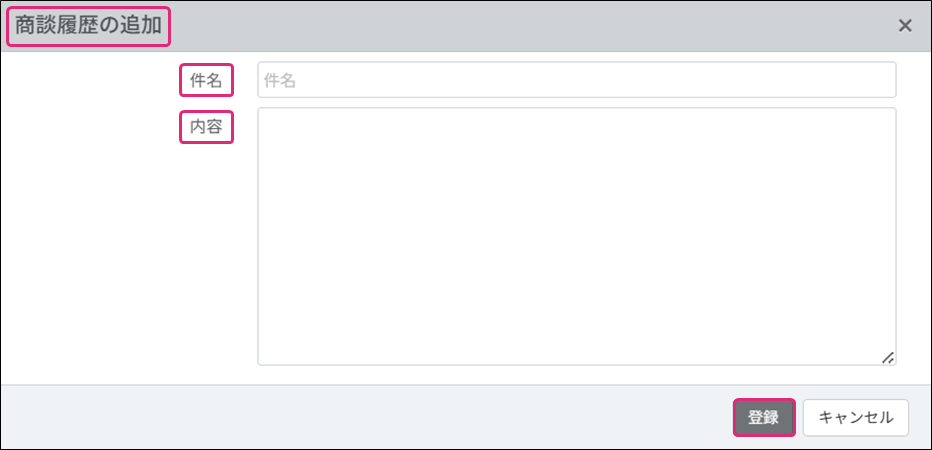 5. [商談履歴の追加]が表示されます。[件名][内容]を入力し、[登録]をクリックします。