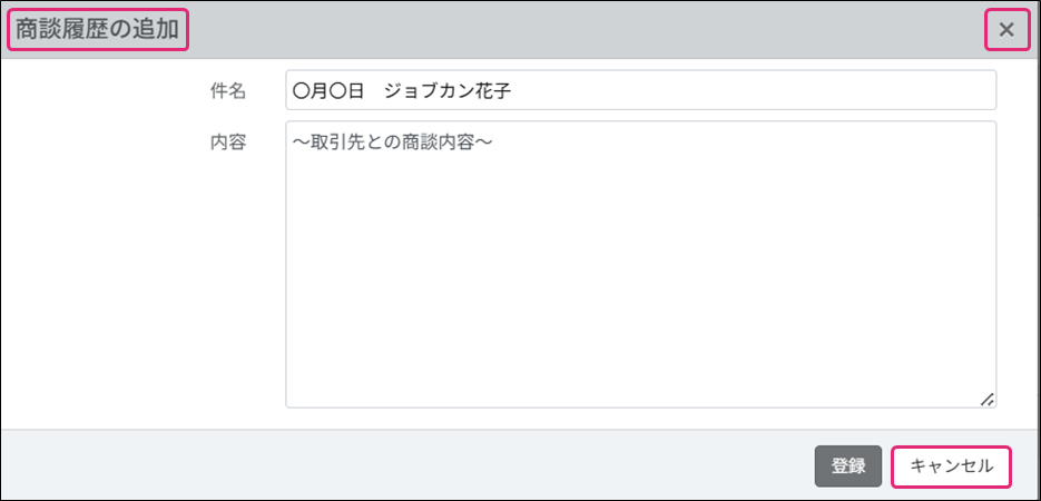 5. [商談履歴の追加]が表示されます。商談内容を確認し、[✕]もしくは[キャンセル]をクリックしましたら完了です。