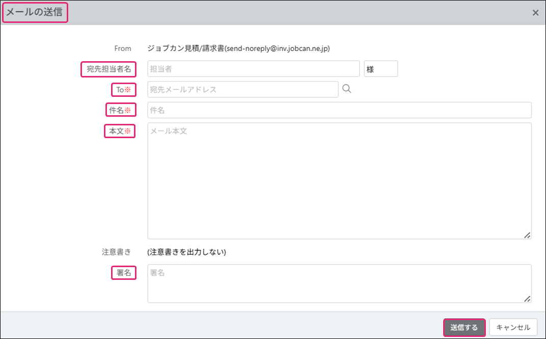 5. [メールの送信]が表示されます。[宛先担当者名][To][件名][本文][署名]を入力し、[送信する]をクリックします。