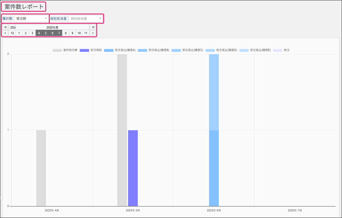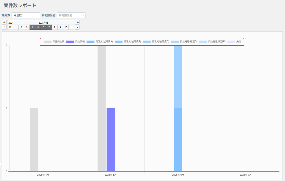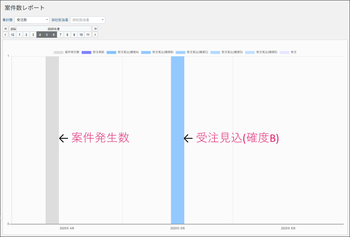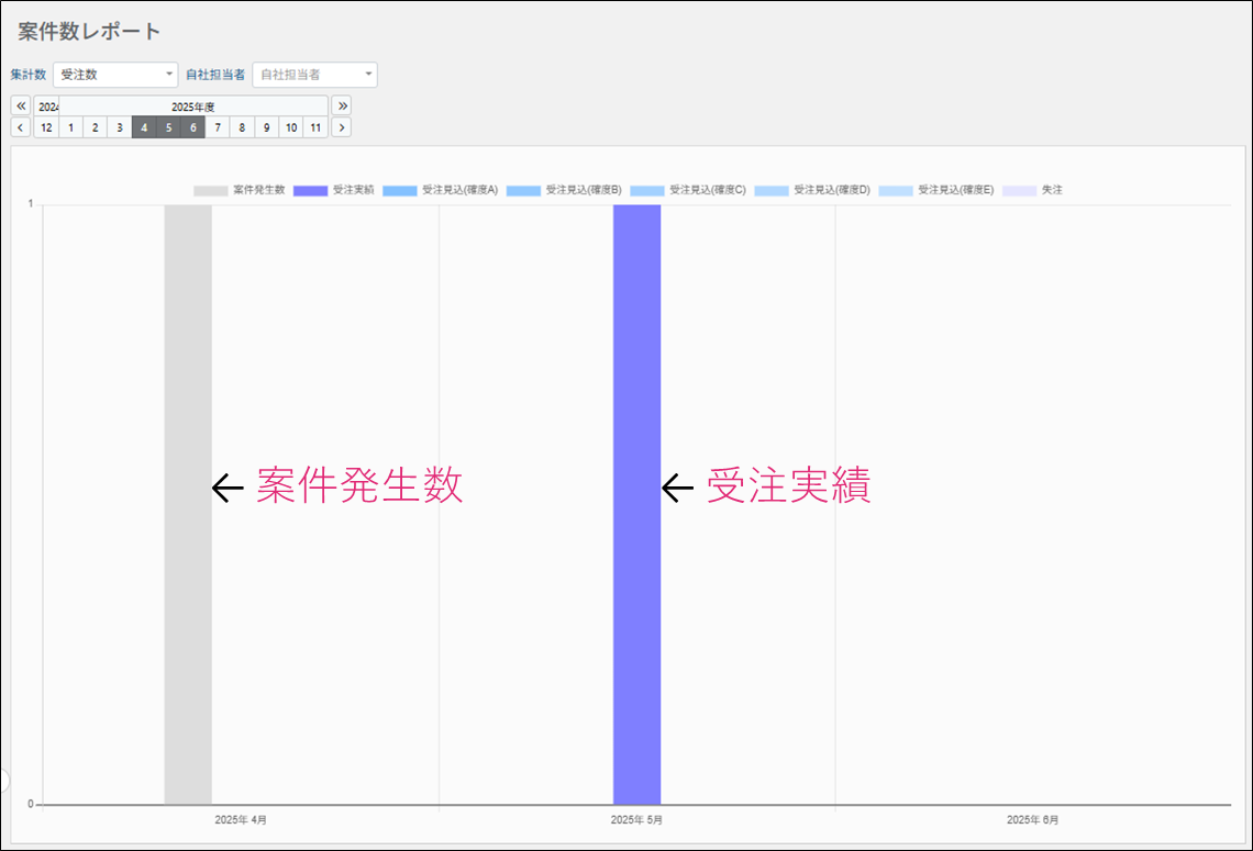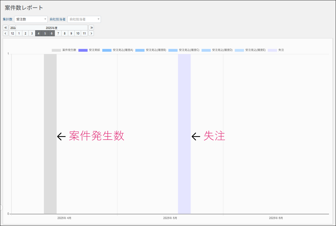 [案件発生数]・[受注実績]・[受注見込(確度毎に色別表示)]・[失注]が表示されます。