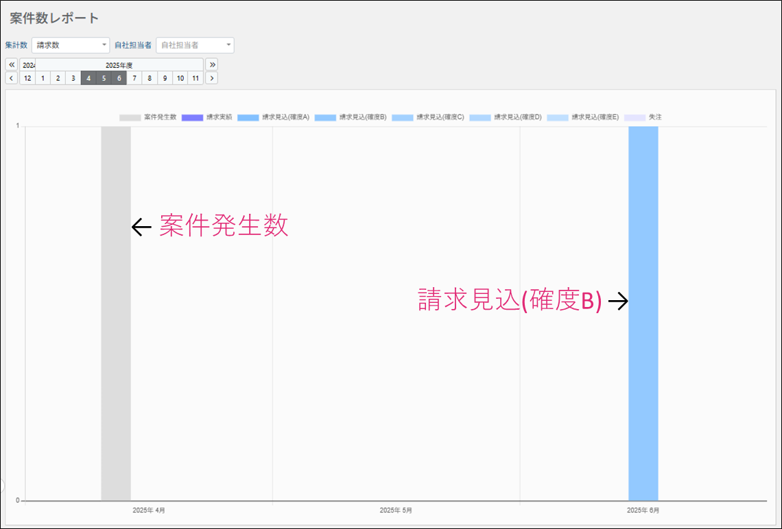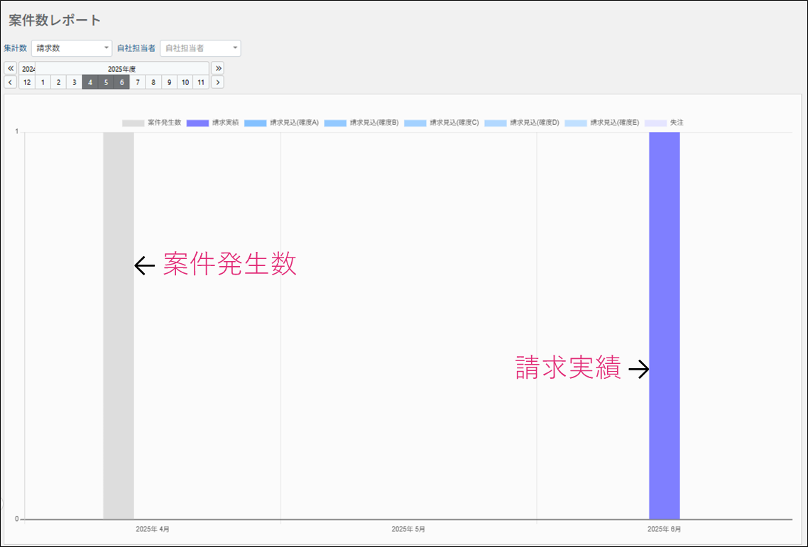 [案件発生数]・[請求実績]・[請求見込(確度毎に色別表示)]・[失注]が表示されます。