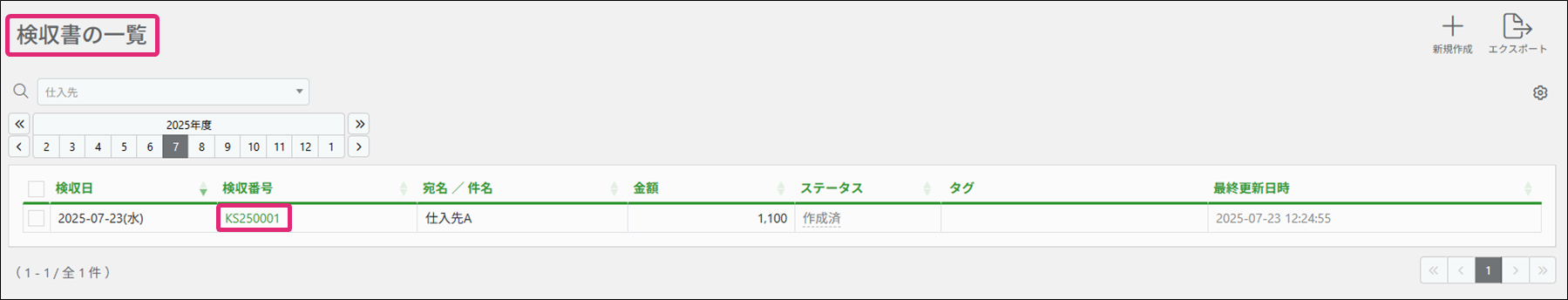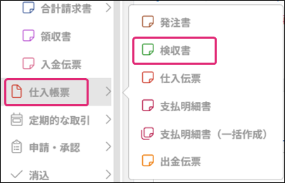 1. メニュー[仕入帳票]→[検収書]をクリックします。