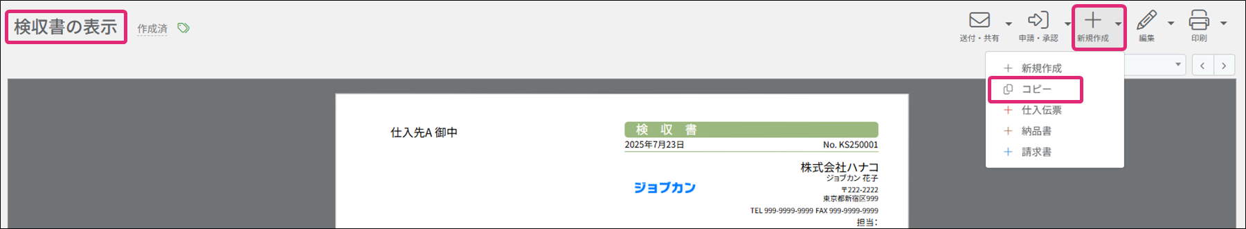 3. [検収書の表示]画面が表示されます。画面右上の[新規作成]→[コピー]をクリックします。