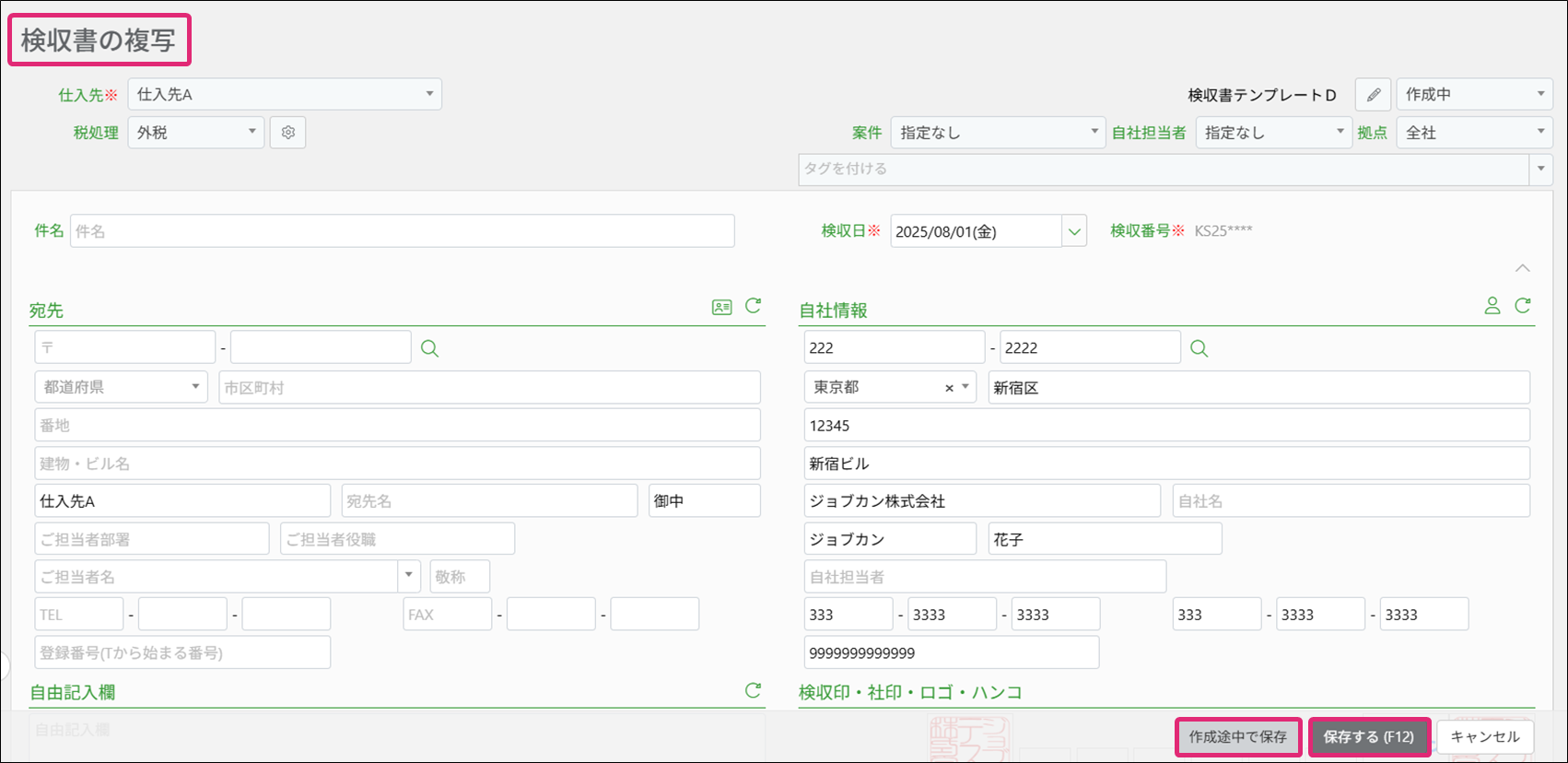 5. [検収書の複写]画面が表示されます。必要に応じて修正を行い、[保存する]または[作成途中で保存]をクリックします。