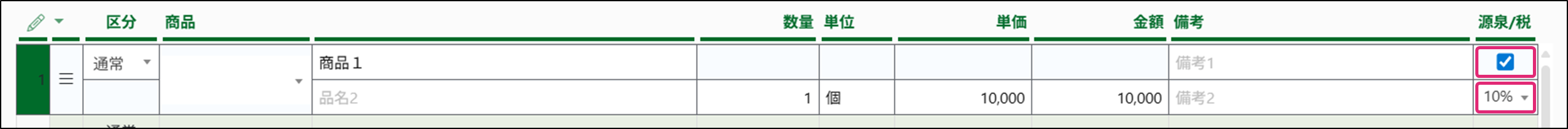 8. 源泉所得税の対象とする商品の場合は税率上のチェックボックスにチェックを付けます。税率を変更したい場合は、その下の税率箇所をクリックし変更します。