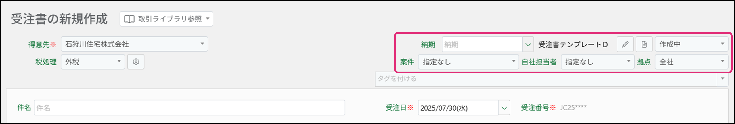 [受注番号]は自動で入力され、「****」部分は保存時に数字に変換されます。一旦保存すると、編集画面で受注番号の変更ができます。
