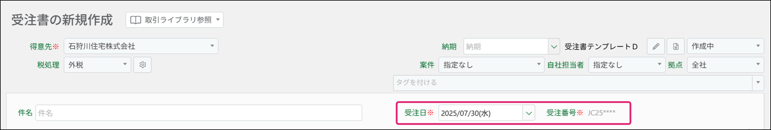 5. [受注日][受注番号]を入力します。