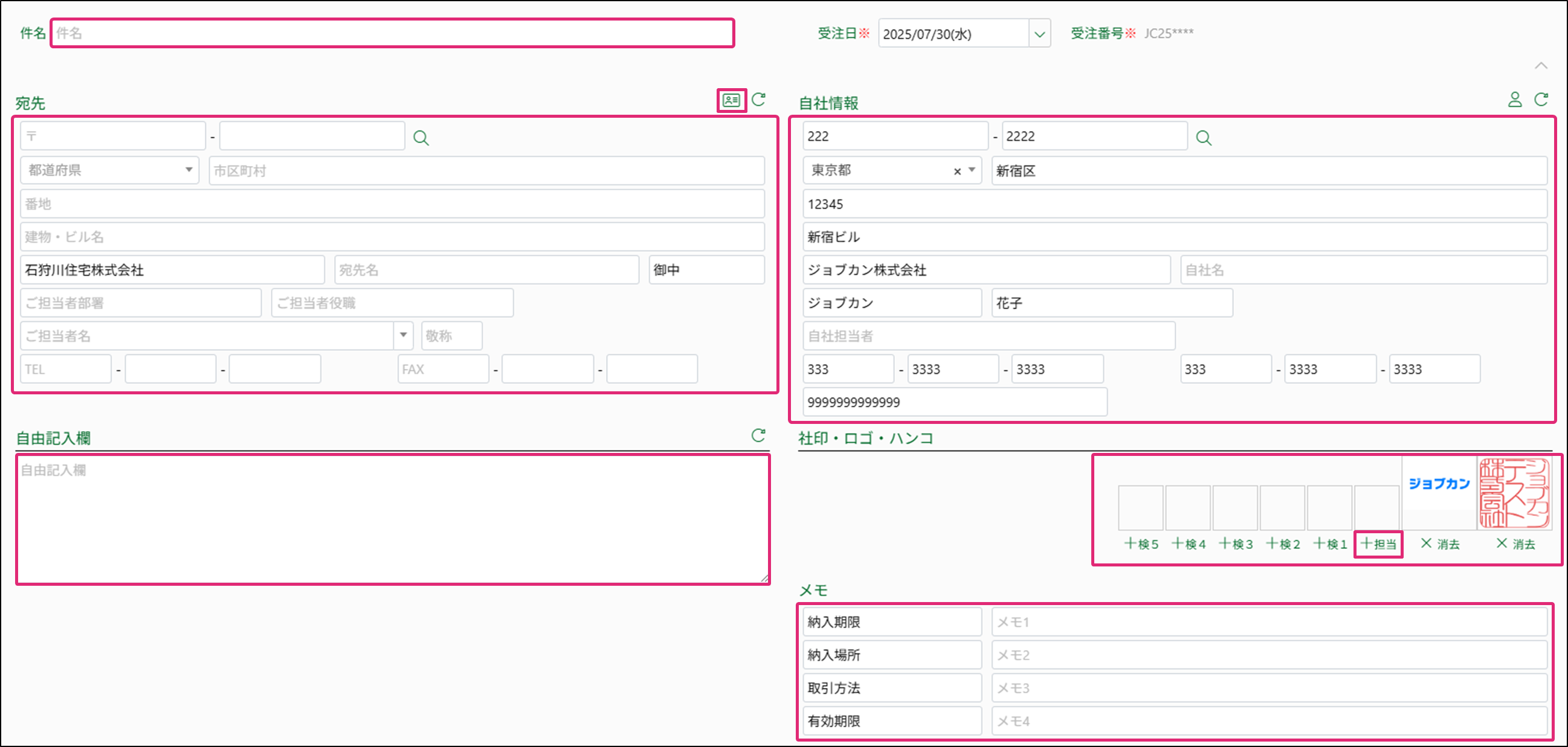 6. [件名][自由記入欄][メモ]などを入力したり、[宛先][自社情報]の修正をします。担当印は、手順4で自社担当者を選択後、[社印・ロゴ・ハンコ]にある[+担当]をクリックすると押印されます。※送付先を変更する場合は、[宛先]右側の