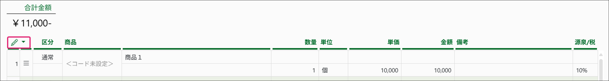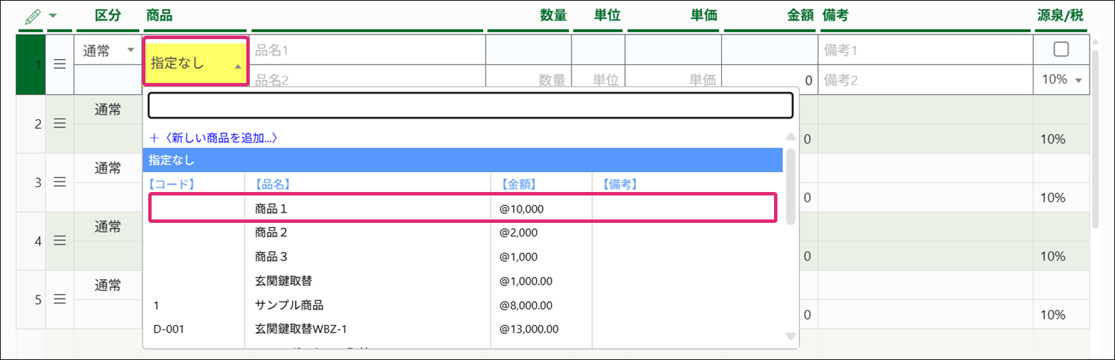 7. 明細入力部で[商品]の入力欄をクリックし、リストから商品を選択します。各商品に登録してある情報が入力されます。